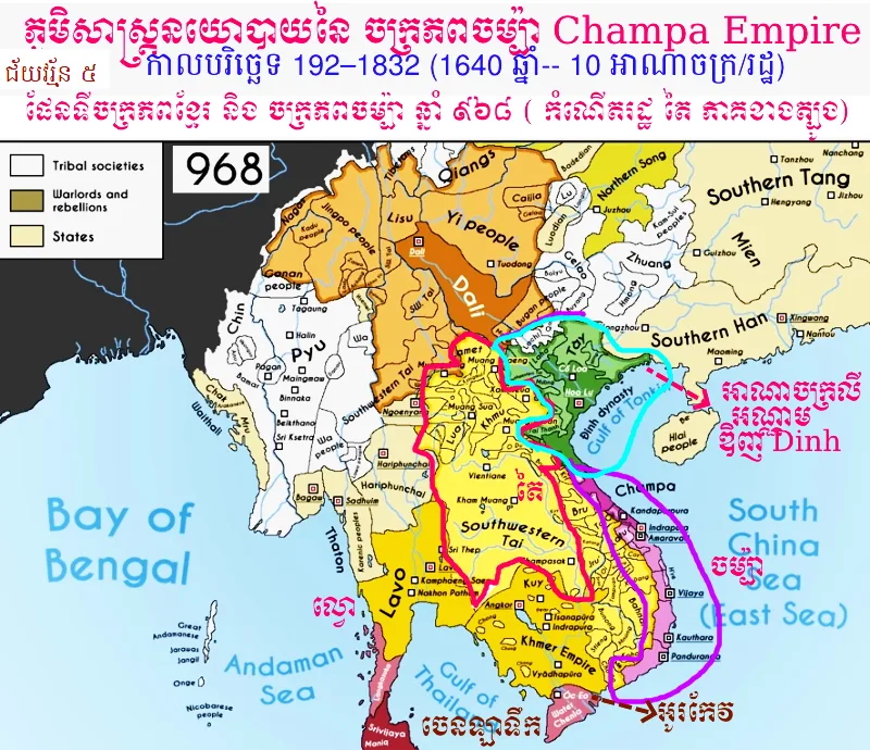 ផែនទី ស្ថានការណ៍ ចម្ប៉ា ខ្មែរ ឆ្នាំ ៩៦៨ រជ្ជកាល ជ័យវរ័ន្មទី ៥