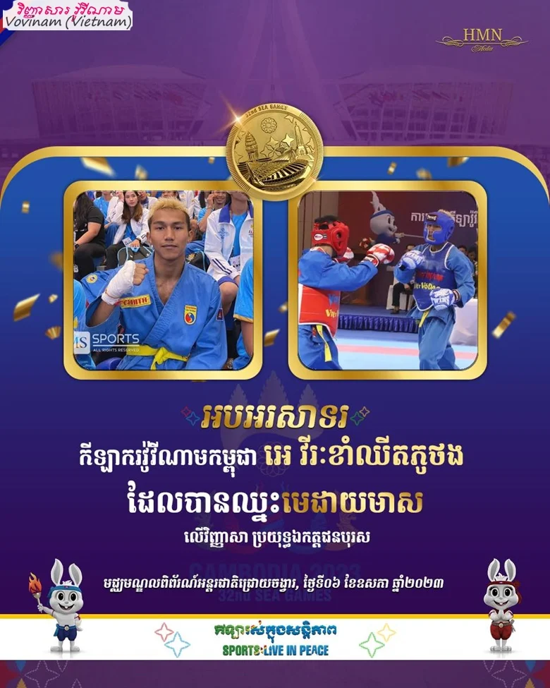 Prak Vanda អបអរសាទរកីឡាករវ៉ូវីណាម លី បូរ៉ាមី ឈ្នះមេដាយមាស លើវិញ្ញាសាសម្តែងមេគុនព្រឹត្តិការណ៍កីឡាស៊ីហ្គេមលើកទី ៣២ នៅមជ្ឈមណ្ឌលជ្រោយចង្វា នាព្រឹកថ្ងៃទី៦ ខែឧសភានេះ ដោយសម្រេចបាន ២៧២ពិន្ទុ។ វិញ្ញាសារ វ៉ូវីណាម VOVINAM