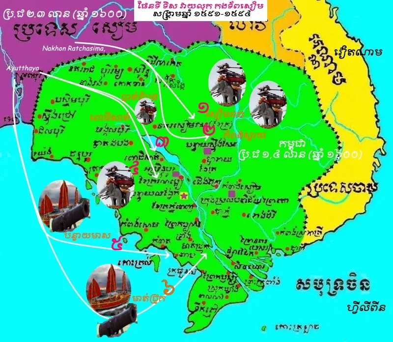ចាប់ពីពេលនោះមក ដោយមានការគាបសង្កត់ពីប្រទេសភូមា ផង និងពីប្រទេសខ្មែរយ៉ាងខ្លាំងក្លាពេកផង ព្រះមហាធម្មរាជាស្ដេចសៀម ត្រូវបង្ខំចិត្ត ទទួលធ្វើសន្ធិសញ្ញាចងស្ពានមេត្រីជាមួយខ្មែរនៅក្នុងឆ្នាំ១៥៧៤ នោះ ដោយព្រមប្រគល់ថ្វាយព្រះមហាក្សត្រខ្មែរនូវខេត្តនគររាជសីមា បស្ចឹមបុរី ច័ន្ទបុរី ហើយធ្វើព្រះរាជពិធីសត្យសញ្ញាព្រះរាជមេត្រី និងបោះគោលសីមាត្រង់តំបន់រអាងសិលា “ខេត្តស្រះកែវ” ជាព្រំប្រទល់ប្រទេសទាំងពីរផង។ គឺដោយហេតុនេះហើយ បានជាវិសាលភាពនៃប្រទេសកម្ពុជា ក្នុងសតវត្សទី១៦ នោះ មានភាពធំទូលាយបង្គួរ គឺខាងត្បូងទល់សមុទ្រ ខាងកើតទល់នឹងប្រទេសចំប៉ា ឯខាងលិចខេត្តនគររាជសីមា សង្គាស គោកខ័ណ្ឌ ស៊ីសាកេត បស្ចឹមបុរី ច័ន្ទបុរី ត្រាត រយ៉ង ។ល។ នៅជារបស់ខ្មែរទាំងអស់។